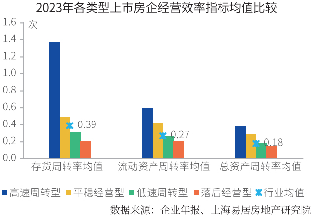 2023年上市房企存货周转率均值为0.39,较上年提升0.02;流动资产周转率均值为0.27,较上年下降0.01;总资产周转率均值为0.18,较上年下降0.02。在保交付的压力下,房企加快了周转速度,同时投资态度谨慎,存货总量下降,上市房企存货周转率均值同比小幅提升。受销售金额下降影响,流动资产周转率均值、总资产周转率均值继续下滑。