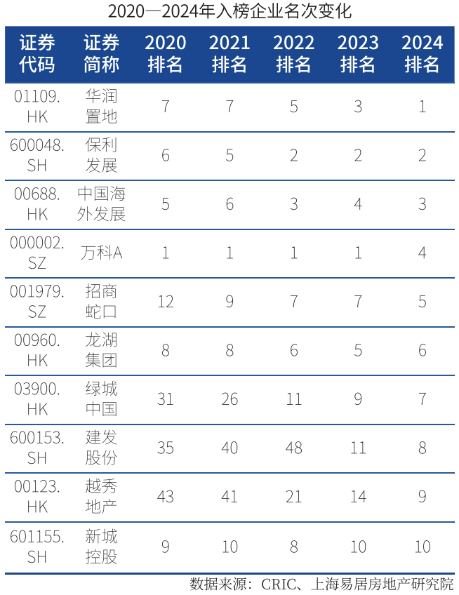 根据《2024房地产上市公司测评研究报告》,10强上市房企排名出现变化,榜单变动率为20%。其中,华润置地排名升至榜首,保利发展保持第二名,中国海外发展第三名,较上年提升了1个位次;万科A、招商蛇口、龙湖集团、绿城中国、建发股份、越秀地产和新城控股分列第四至第十名,建发股份和越秀地产为2024年新晋10强。