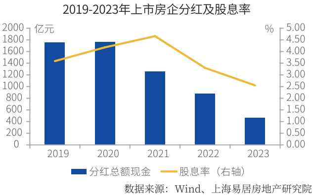 2023年,上市房企的每股收益平均值有所下降。房地产销售规模持续缩水,房企销售结转收入下降,同时在毛利率下降、计提资产减值、投资收益减少等因素共同作用下,营业利润减少,房企盈利空间收缩,从而影响每股平均收益。尽管上市房企估值水平与上年基本持平,但市盈率和市净率指标仍低于全市场平均水平,表明市场对于房地产行业前景较为悲观。同时,上市房企盈利能力大幅下滑,多家房企仍面临债务化解、融资困难等挑战,房企分红总额继续下降,股息率创新低。
