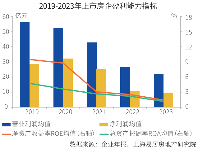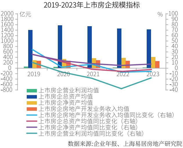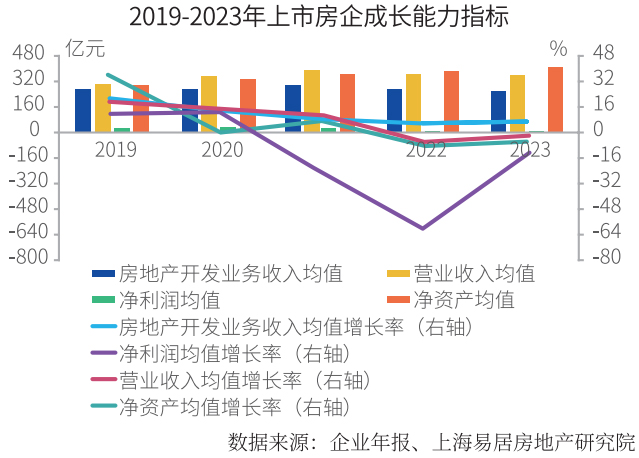 2023年,上市房企总资产均值为1429.20亿元,同比下降2.2%;净资产均值为412.84亿元,同比上涨7.61%;房地产开发业务收入均值为257.94亿元,同比下降5.73%;营业利润均值为21.95亿元,同比下降17.86%。增速方面,净资产均值持续增长,增幅较上年有所扩大,房地产开发业务收入、总资产、营业利润均值继续下跌,下跌幅度较上年有所收窄。