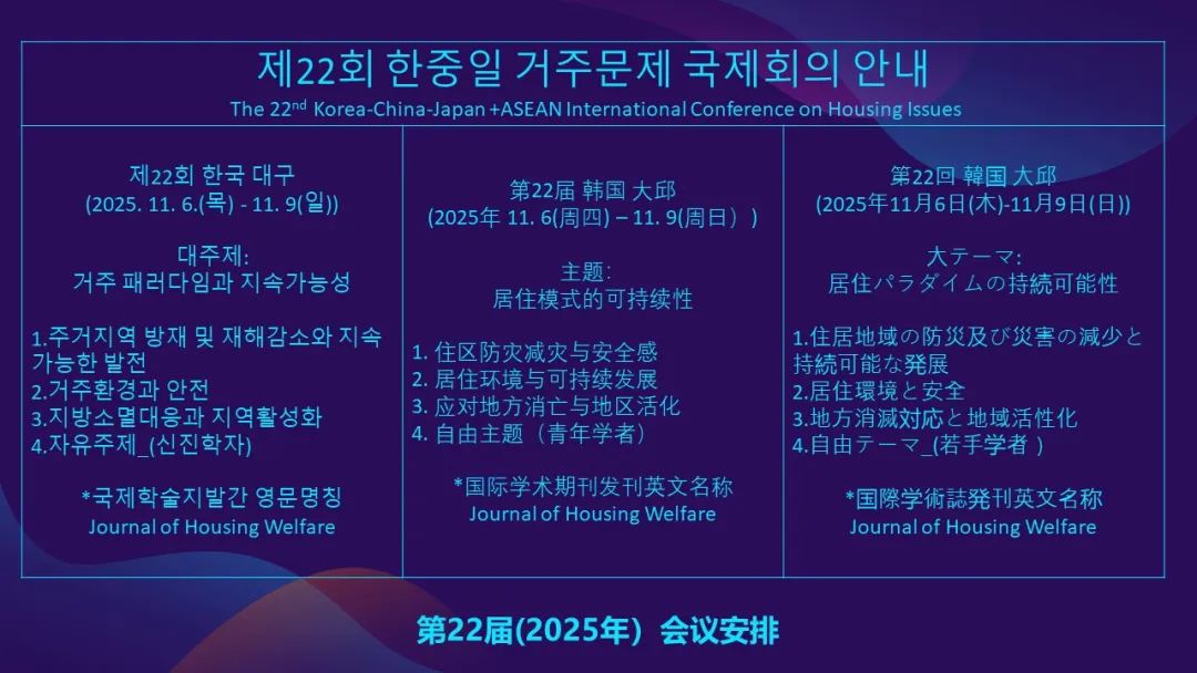 经中日韩三方理事会商议,第22届中日韩+东盟居住问题国际会议将于2025年11月6日-9日在韩国大邱举行,会议主题为:居住模式的可持续性。子专题1:住区防灾减灾与安全感;子专题2:居住环境与可持续发展;子专题3:应对地方消亡与地区活化;自由专题(青年学者)。