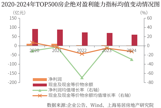 2024年TOP500房地产开发企业营业收入均值95.08亿元,同比下降11.57%,降幅较上年有所扩大。营业成本均值80.93亿元,同比下降6.72%。净利润均值2.25亿元,同比下降29.46%,现金及现金等价物余额均值60.71亿元,同比下降12.21%,行业整体销售持续回落,同时外部融资难问题依然存在,房企持有现金规模持续萎缩。