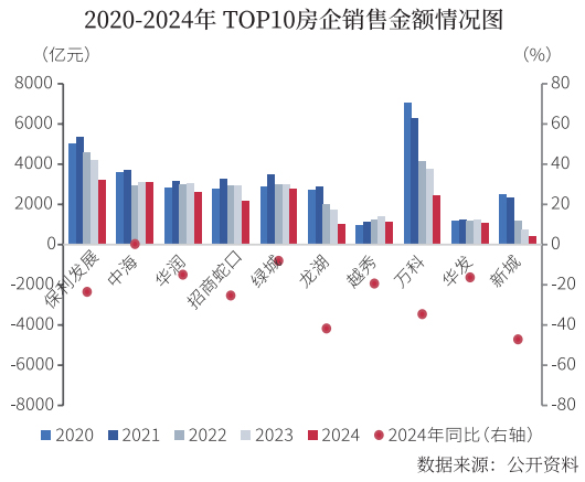 2024年TOP10房企中,仅有中海销售金额实现小幅正增长,其余9家房企全年销售金额同比下降。在市场持续下行期,企业间分化现象更加明显,民营房企同比降幅远高于央国企。2024年销售金额超过三千亿元的仅有中海、保利发展两家房企,数量较上年减少两家。当前市场对头部房企的投资能力提出了更高的要求,在核心城市优质地块出让带动下,头部房企拿地竞争激烈,房企维持销售规模存在较大压力。