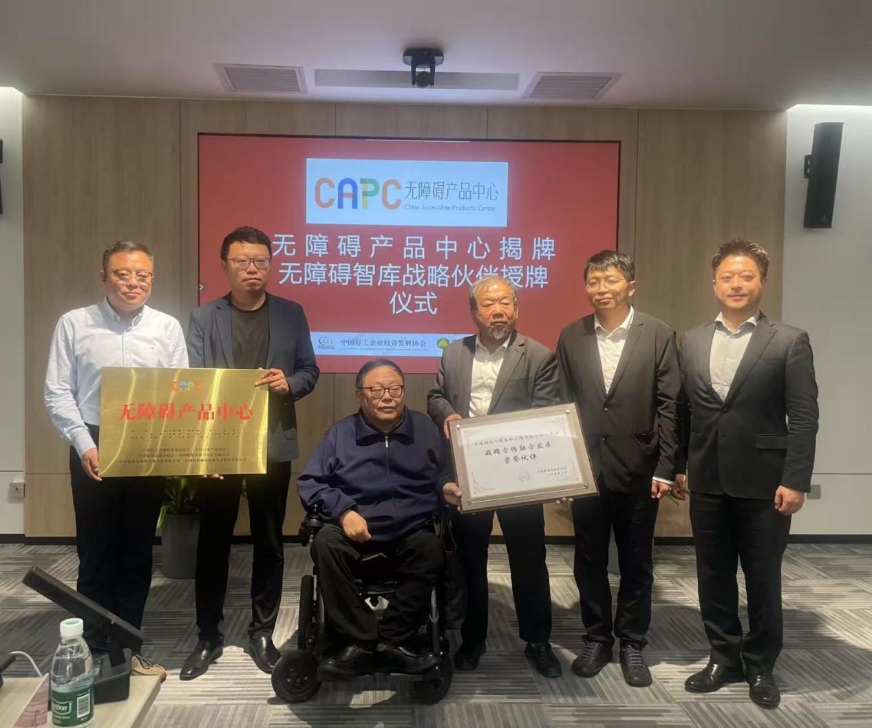 汇报会现场,中国助残志愿者协会会长吕世明、中国房地产业协会副会长赵成、中国轻工企业投资发展协会理事长李国都、副秘书长李木森、无障碍产品中心主任姚江、秘书长叶晓雷、无障碍经济发展专委会媒体中心副主任张璇、中国助残志愿者协会无障碍智库专家吕志强教授、中国船级社质量认证无障碍环境建设服务与推广中心总经理张毅、中国国检测试控股集团股份有限公司评级中心副总经理马丽萍、中国建筑标准设计研究院有限公司无障碍技术研究中心主任李姝婷等领导嘉宾共同举行了无障碍产品中心揭牌仪式及无障碍智库战略合作单位授牌仪式,这标志着中心的正式成立与运营,通过整合各方资源与技术优势,战略合作将重点推进无障碍环境建设标准制定、技术创新和成果转化,为残障人士创造更加便利的生活环境。此次仪式的举办不仅确立了各方的长期合作关系,更为推动我国无障碍事业高质量发展提供了强有力的支撑平台,开启了无障碍事业发展的新篇章。
