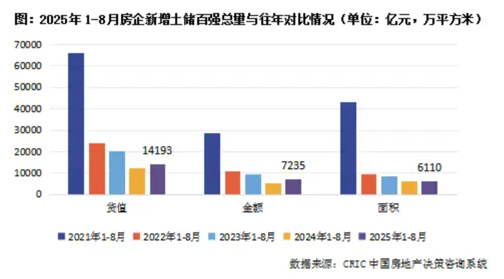 总量方面,截止至8月末,新增土储百强房企的新增货值、总价和建面百强之和分别为14193亿元、7235亿元和6110万平方米,货值同比增长17.5%,金额同比增长30.8%,建面同比微跌1%。
