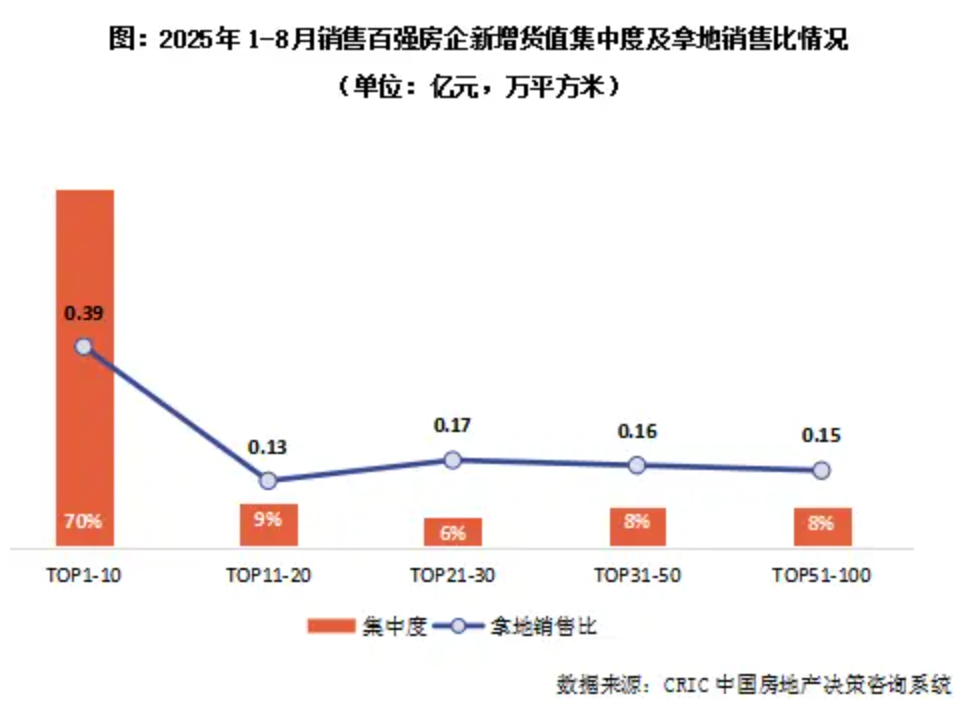 报告显示,前8月销售百强房企拿地集中度保持高位,TOP10房企新增货值占百强70%,与上月基本持平,市场格局进一步集中于头部企业。此外,各梯队新增货值占比均保持稳定、变化不大,TOP11-20新增货值占比9%,TOP21-30新增货值占比6%,TOP31-50和后50强新增货值各占8%。