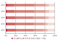 - 根据区域划分,华东地区占比42.0%,中部地区占比12.2%,东北地区占比2.6%,比重较上年有所上升;华北地区占比13.6%,西部地区占比7.0%,比重较上年有所下降,华南地区占比22.4%,与上年持平。华东、中部地区房企数量占比均较上年上升0.6%,华北房企数量占比较上年下降0.8%,降幅最大。