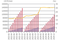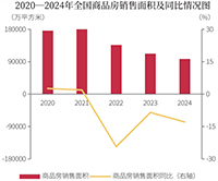 - 2024年,我国房地产市场延续调整态势。新建商品房销售面积及销售金额累计同比全年均处于负增长区间,但在中央稳地产政策持续升级下,市场筑底趋稳态势渐显。