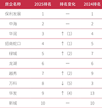 - 2025房地产开发企业综合实力TOP500前三位由保利发展、中海、华润占据。其中,保利发展、中海分别保持第一、第二位,华润上升至第三位,招商蛇口、绿城、龙湖、越秀、万科、华发、新城分列第四至第十位。