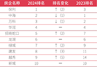 - 2024房地产开发企业综合实力TOP500前三位由保利、中海、万科占据。其中,保利超越中海、万科,升至第一,华润保持第四,招商蛇口、龙湖、绿城、建发、越秀、新城分列第五至第十位。